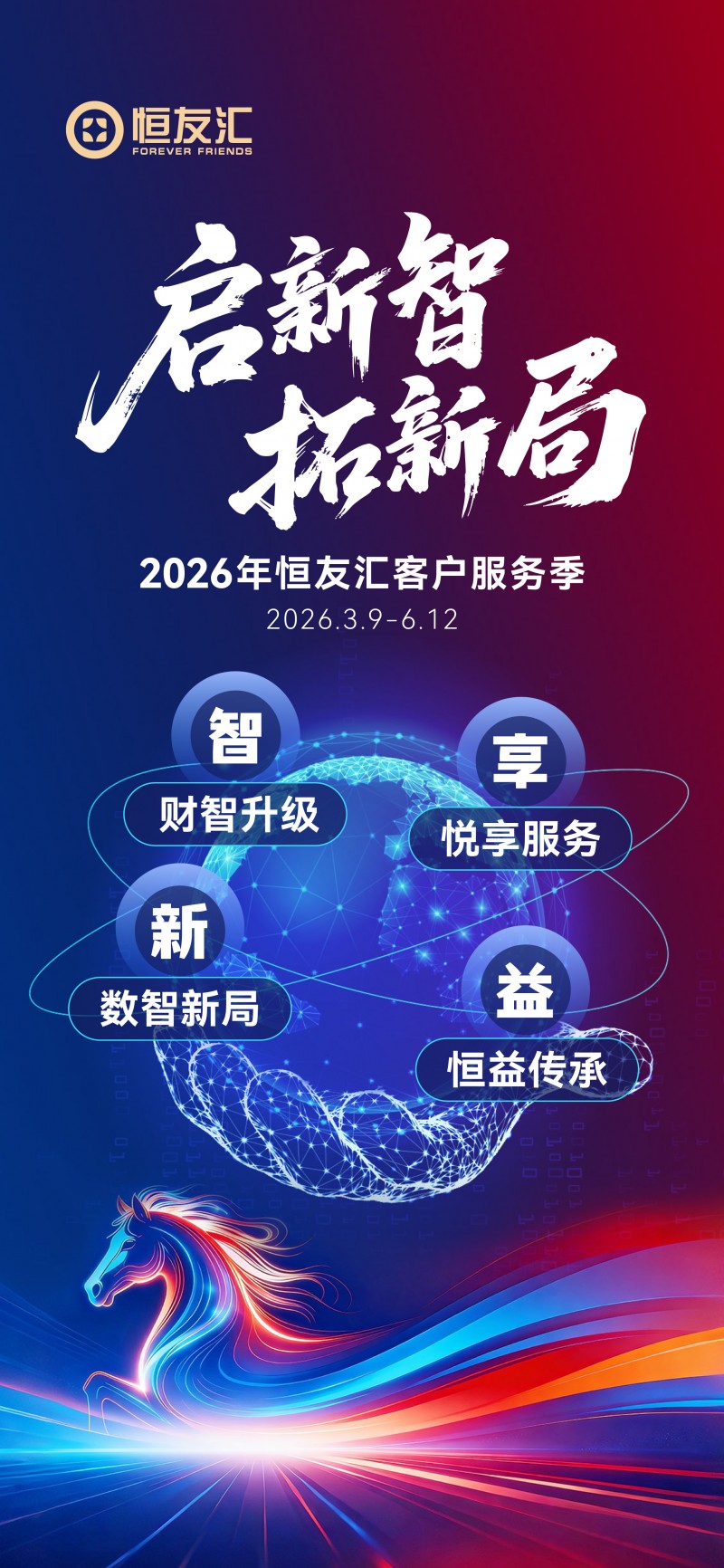 为全面升级财智服务生态,以躬身实干诠释“奔腾进取、笃行致远”的时代精神,恒友汇锚定“品质化、数智化、国际化”三大战略方向,于今日重磅启幕“启新智 拓新局”第三届客户服务季。本届服务季从3月9日持续至6月12日,紧扣“服务、速度、进化”三大核心词,焕新升级“智汇伙伴+”服务体系,并以“财智升级、悦享服务、数智新局、恒益传承”四大板块为核心引擎,为广大会员打造一场集财富增值、品质生活、全球视野与精神传承于一体的全方位精品服务盛宴。