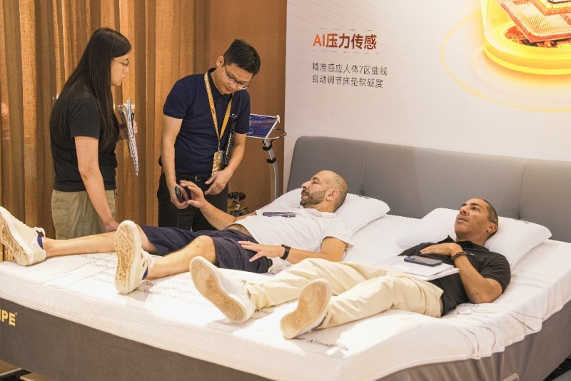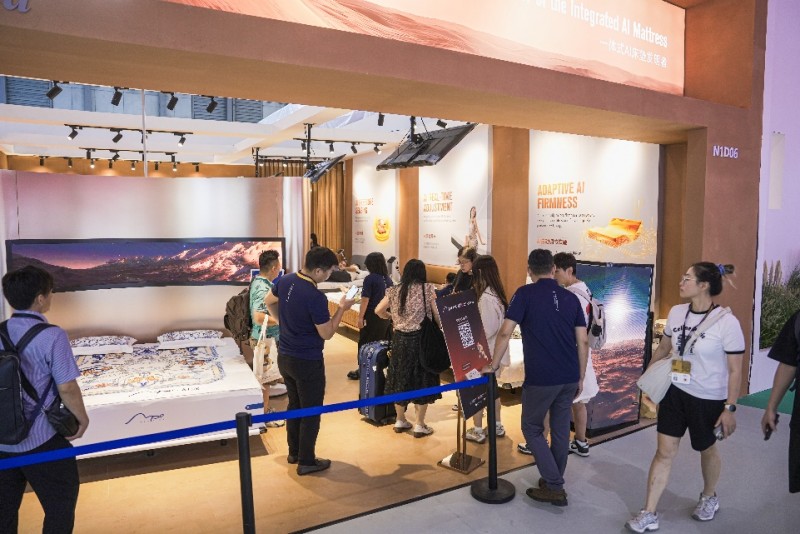 开展首日,AI·寐展位即吸引了众多国内外专业观众驻足体验。这款全球首张会对话的智能床垫,通过语音交互功能,用户可以通过"小智小智,今天天气如何"等语音指令与床垫进行实时对话,实现了从被动执行到主动回应的技术突破。