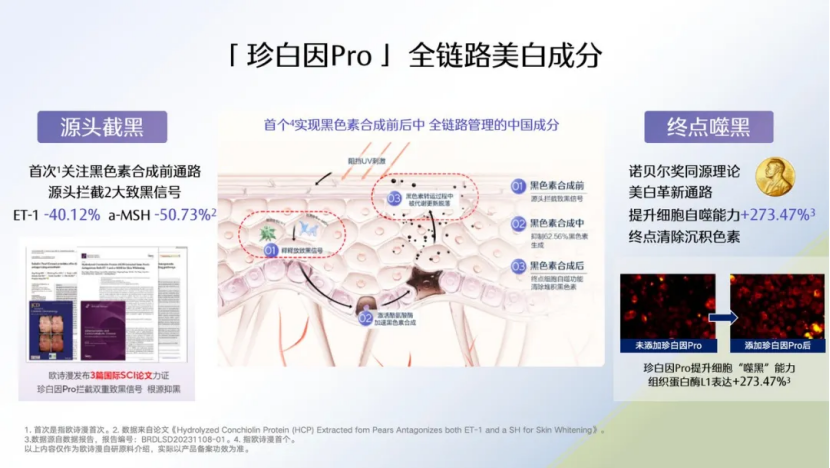 作为首个实现黑色素全链路管理的中国成分,「珍白因Pro」不仅可以从源头抑制致黑信号,还能抑制黑色素生成信号、酪氨酸酶活性和黑色素运转、加速黑色素代谢,实现从黑色素的生成到运转到代谢的全链路美白。