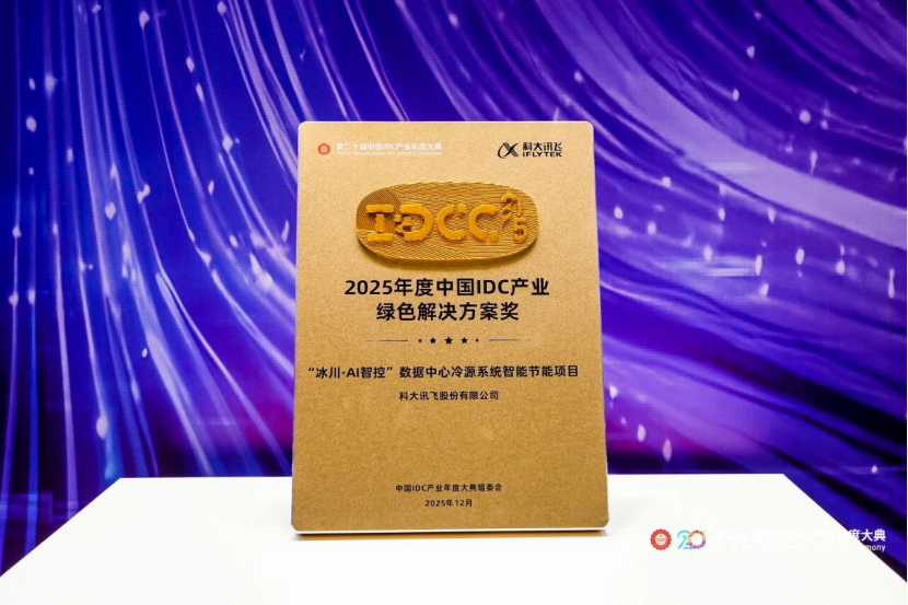 2025“中国IDC产业年度评选” 颁奖典礼同步开展,科大讯飞技术中心数据中心团队联合智慧城市BG智能化团队自主研发的“冰川·AI智控”数据中心冷源系统节能项目(以下简称“冰川·AI 智控”项目),获得“2025年度中国IDC产业绿色解决方案奖”。科大讯飞在基础设施智能化运维领域的领先实践,为行业提供了可借鉴的节能解决路径。